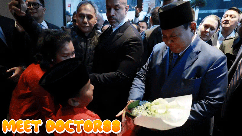 Momen spesial juga terlihat di depan pintu hotel. Dua anak diaspora, Hatta Sanof Kurniawan dan Adriella Namarga Pandjaitan, tampil dengan pakaian adat Nusantara. Keduanya menyerahkan karangan bunga kepada Prabowo yang menerimanya dengan penuh kehangatan, sembari mencium kepala mereka.